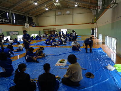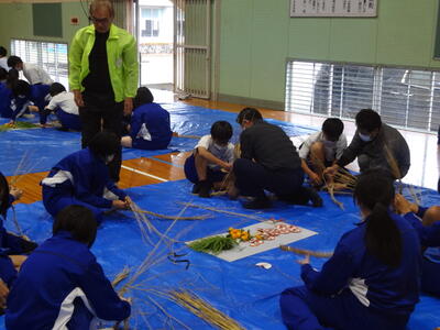12月14日(木)に体育館で全校生徒、職員、PTA、穂北づくり協議会、子ども未来部会の皆さまでしめ縄づくりを行いました。9つの班に分かれ、子ども未来部会、穂北づくり協議会、PTAの皆さんに指導者として入っていただき、しめ縄づくりを行いました!完成したしめ縄を大事そうに生徒たちは持って帰っていました。指導してくださいました皆様、ありがとうございました。来年は辰年!よい年が迎えられそうです。