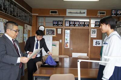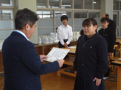 令和7年度西都児湯地区中学校総合体育大会で3位入賞を果たした女子バレー部と女子ソフトテニス部の表彰を行いました。また、ワールドアスリートに選ばれた中武さんの認定証授与も行いました。