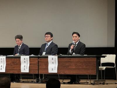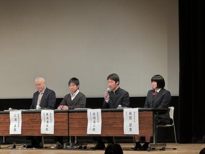 11月30日(木)穂北児玉久右衛門の絵本を作る会の皆様のご尽力をいただき第1回「先輩の声を聞く会」を開催しました。今回は、日南グループの代表である堀江勝人様に来ていただき講演をしていただきました。生徒との質疑・応答では、数多くの質問が出され、和やかな中にも迫力ある回答に生徒たちは引き込まれていきました。