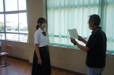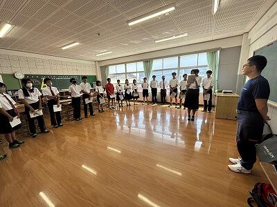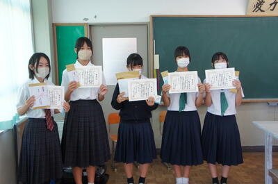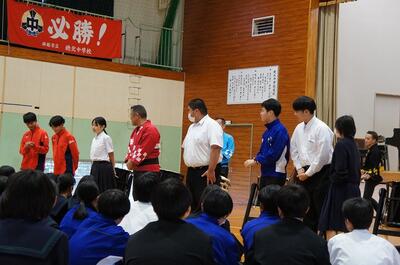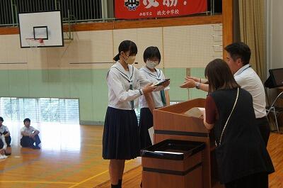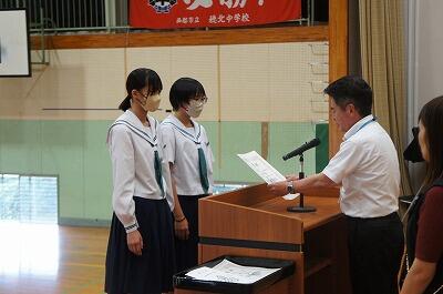 令和7年度西都児湯地区中学校総合体育大会で3位入賞を果たした女子バレー部と女子ソフトテニス部の表彰を行いました。また、ワールドアスリートに選ばれた中武さんの認定証授与も行いました。
