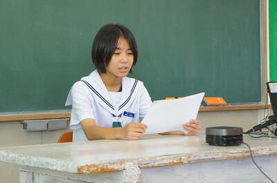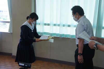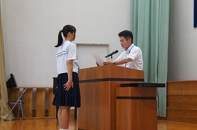 7月19日(金)令和6年度第1学期の終業式が行われました。最初に穂北まちづくり協議会より人権標語の表彰が行われました。終業式では、各学年の代表者と生徒会代表が1学期を振り返って発表してくれました。1学期は新入生が入学し、5月に行われた体育大会では、一生懸命に取り組む素晴らしさを表現し、6月の中体連では3年生を中心に、懸命に頑張り抜く姿を見せてくれました。また、7月には1年生はふるさと探訪、2年生は修学旅行、3年生は「Future We Want」で地域貢献について探究活動を行いました。それぞれの学年が成長してくれた1学期になりました。