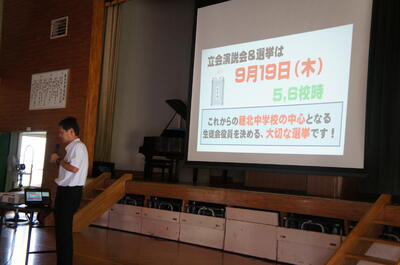 4月11日(金)の5・6校時に生徒会オリエンテーションが行われました。中学校の特徴である生徒会活動と委員会活動についての説明を行った後に、部活動紹介がありました。野球部、女子ソフトテニス部、サッカー部、女子バレー部の部活動紹介とボランティア活動を行ってくれているフリースタッフの紹介がありました。