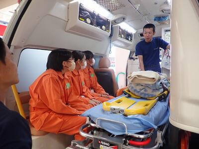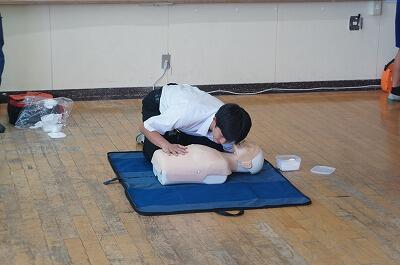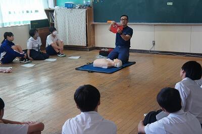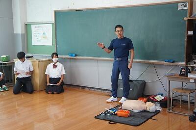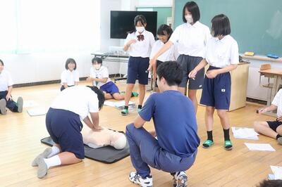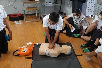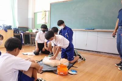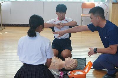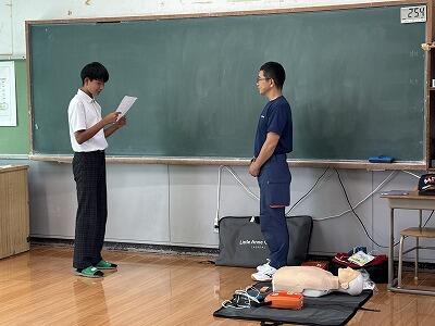 9月11日(水)に地震の避難訓練と心肺蘇生法の講習会を消防署より3名の指導者をお招きして実施しました。最初に地震が起きた時の行動を確認し、教室での一次避難、二次避難として体育館に移動して、避難状況の確認を行いました。地震が生きた際に、家族との集合場所の約束をしておくよう指導しています。その後、各教室に移動して心肺蘇生について学習しました。生徒たちに対する心肺蘇生講習は、コロナ禍の時期は実施していなかったので、久しぶりの実施となりました。講習の様子をお伝えします。