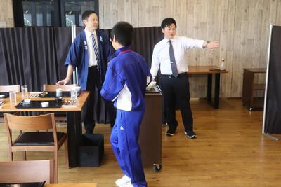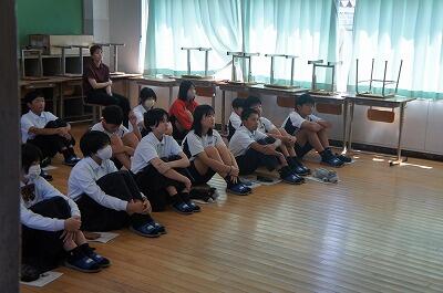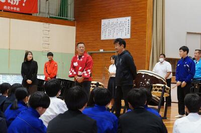 5月24日(土)の体育大会で毎年披露している、男子生徒によります下水流臼太鼓踊りの練習が始まりました。臼太鼓保存会の皆様に来校していただき、陣形の確認、足の運び方等の指導をしていただきました。女子生徒はソーラン節の練習に取り組んでいます。