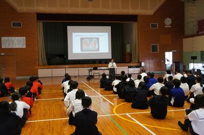 3月14日(金)に「児玉久右衛門の絵本を作る会」の横山邦夫会長、長谷川裕康副会長、小島貴代子様に来校していただき、卒業する3年生に児玉久右衛門の絵本を贈呈していただきました。小島様からは、なぜ絵本を出版することになったのかの経緯を説明していただきました。また横山会長からは児玉久右衛門という偉人がこの穂北にいたことを誇りにしてほしいというお話をいただきました。