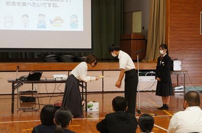 11月21日(木)に給食感謝集会を行いました。講師の恵利先生に来ていただき、西都市給食センターでどのように給食が作られているのかを説明していただきました。毎日おいしい給食に感謝しています。
