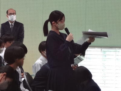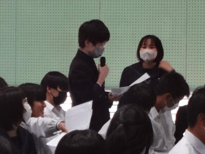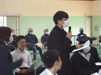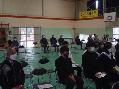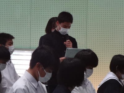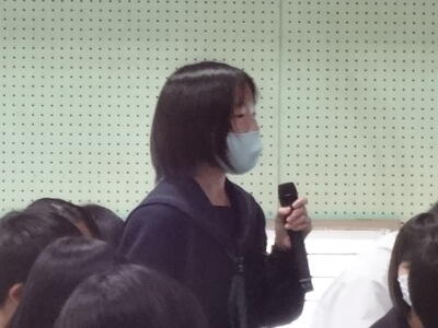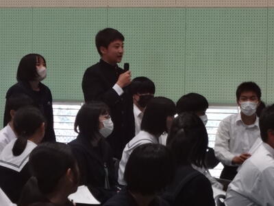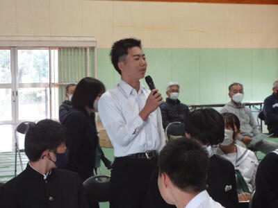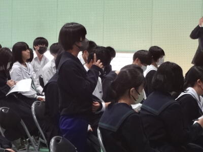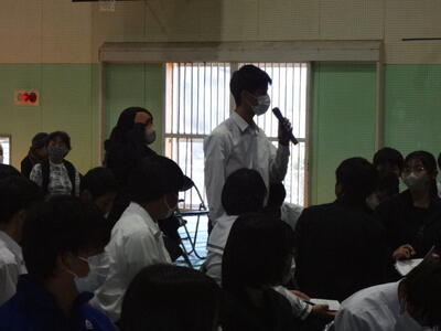 11月30日(木)穂北児玉久右衛門の絵本を作る会の皆様のご尽力をいただき第1回「先輩の声を聞く会」を開催しました。今回は、日南グループの代表である堀江勝人様に来ていただき講演をしていただきました。生徒との質疑・応答では、数多くの質問が出され、和やかな中にも迫力ある回答に生徒たちは引き込まれていきました。