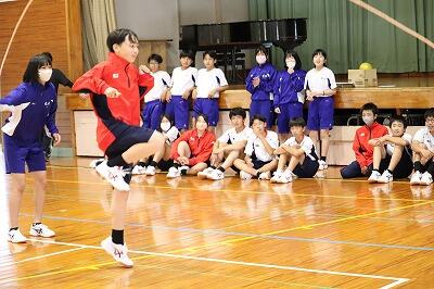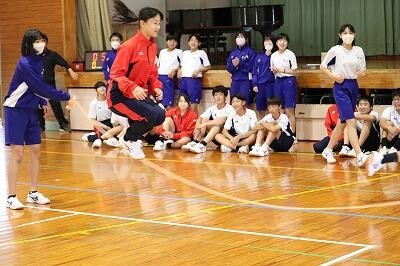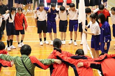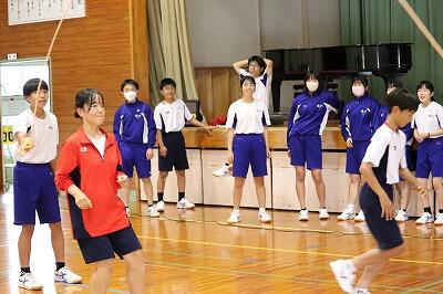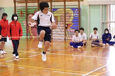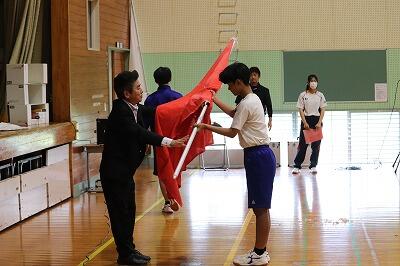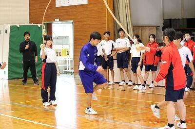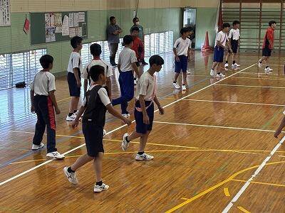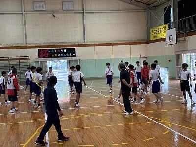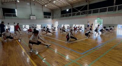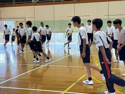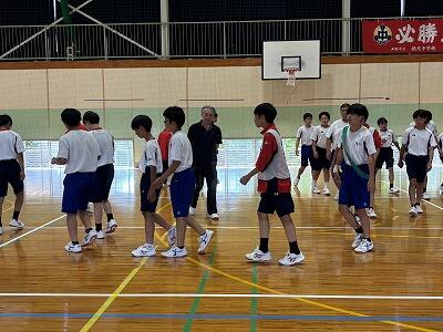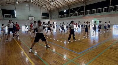 5月24日(土)の体育大会で毎年披露している、男子生徒によります下水流臼太鼓踊りの練習が始まりました。臼太鼓保存会の皆様に来校していただき、陣形の確認、足の運び方等の指導をしていただきました。女子生徒はソーラン節の練習に取り組んでいます。