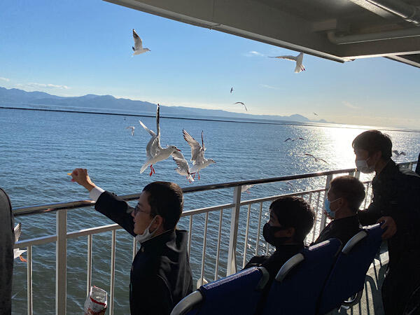 フェリーに乗るときにカモメのエサをもらい、甲板でエサをあげてます。