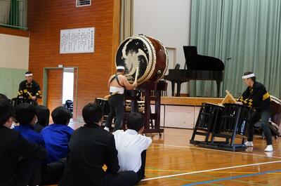 12月6日(金)に鑑賞教室を行いました。今年は宮崎県を代表する太鼓の達人である響座の皆さんに来ていただきました。響座会長の岩切さんも来校され演奏していただきました。生徒の中には、保育園の時にならっていた生徒もおり、大いに盛り上がりました。また、篠笛とピアノの競演もあり楽しい時間となりました。