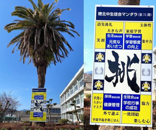 1月19日(水)、玄関前のシンボルツリー・フェニックス前に、生徒会目標マンダラ(本年度は「挑」)の看板を設置しました。