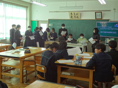 1月12日(金)に本校の中学2年生が台湾の東光中学校とWeb交流を行いました。本校の生徒は、日本のお正月の過ごし方、鏡餅・しめ縄・門松等の正月飾りについて、お正月の料理について、書初め・年賀状・お年玉について、お正月の伝統的な遊びについて、初詣とおみくじについてを各班で発表しました。台湾の東光中からは春節の連句・大みそかの爆竹、神島伝説、ネズミの結婚、おせちの様々なシンボルと祭のタブー、小春節について発表がありました。最後にお互いに質問と回答をして交流は終わりました。