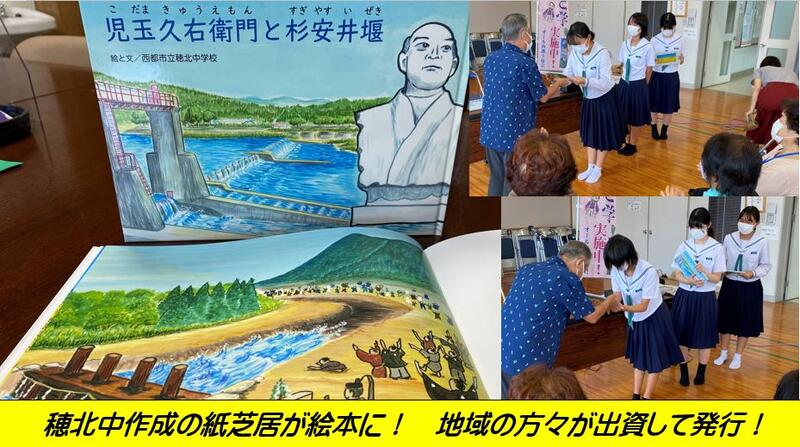 本校の文化系ボランティアサークル「フリースタッフ」が1月に作成した紙芝居「江戸からの贈り物」が絵本になりました。紙芝居を見た主任児童員の小島貴代子さん(本校の学校評議員でもあります)が、この紙芝居をもっと幅広く地域や西都市の方々に普及させたい…という思いで、地域の方々に呼び掛けて寄付金などを集め、鉱脈社から絵本にして発行したのです。7月5日に穂北支所で紙芝居の読み聞かせとともに絵本の贈呈式が行われ、その様子が宮日新聞の記事に掲載されました。