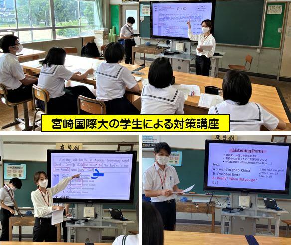 西都市教委では、市内生徒の学力向上や資格取得促進に向け「英検特別講座」を実施して下さっています。教えてくださるのは宮崎国際大学の学生と妻高校生です。本年度第1回目の講座(9/14)には、宮崎国際大の学生3名が来てくださいましたが、その英語力の高さや分かりやすい説明力などに驚きました。非常にテンポよく、具体的で適切な解説シートを使っての解法解説が成されましたが、そのスキルは非常に高く、これを受講できる中学生は幸運と思います。ぜひがんばって受講し、英検取得を目指しtてください。