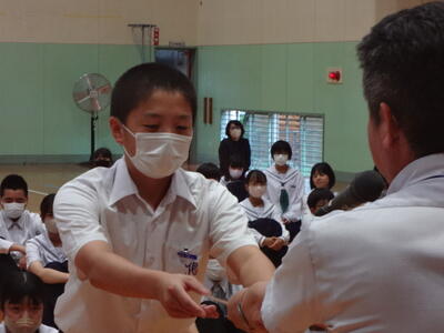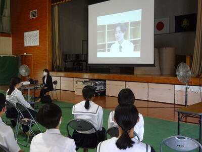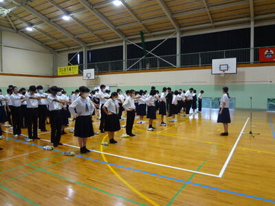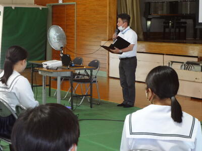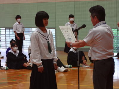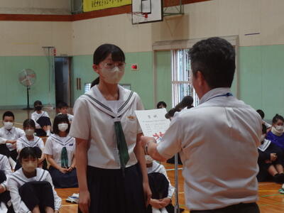 6月21日(水)のほなみの時間を活用して、表彰集会を行いました。今回は西都市バレーボール大会入賞と西都・児湯地区中学校総合体育大会の入賞者の表彰を行いました。水泳競技個人優勝、バドミントン競技準優勝の2人の表彰となりました。県大会での健闘を祈ります。