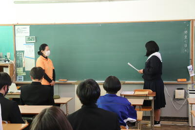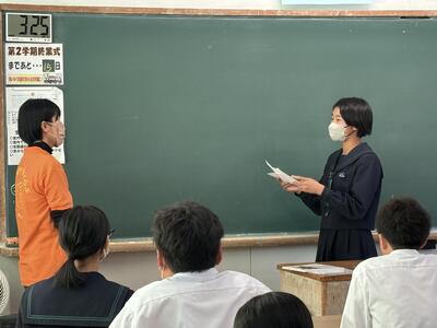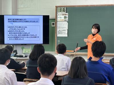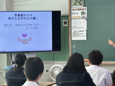 12月7日(木)に第2学年では、講師にか母ちゃっ子くらぶより山中奈緒美様に来ていただき「デートDV、接近欲と接触欲、男女の望ましい関わり方」について学びました。途中、生徒たちの寸劇もあり、楽しい雰囲気の中、相手の人権を尊重する関わり方について学んでいきました。