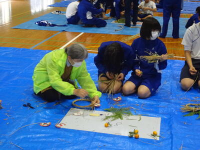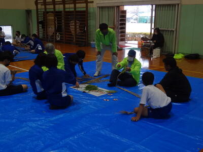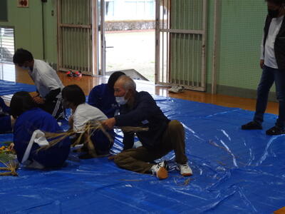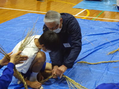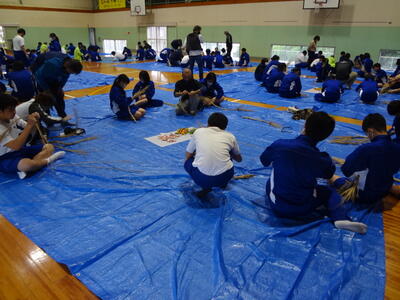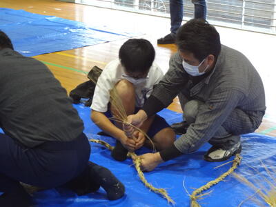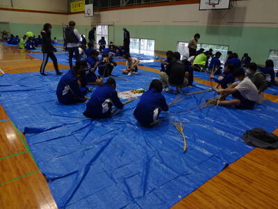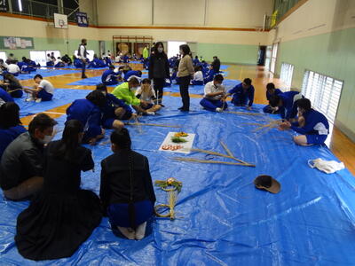 12月14日(木)に体育館で全校生徒、職員、PTA、穂北づくり協議会、子ども未来部会の皆さまでしめ縄づくりを行いました。9つの班に分かれ、子ども未来部会、穂北づくり協議会、PTAの皆さんに指導者として入っていただき、しめ縄づくりを行いました!完成したしめ縄を大事そうに生徒たちは持って帰っていました。指導してくださいました皆様、ありがとうございました。来年は辰年!よい年が迎えられそうです。