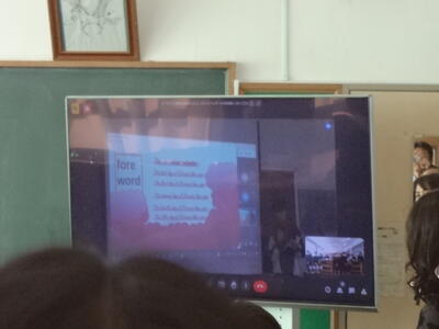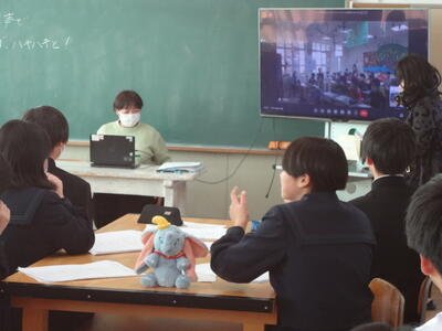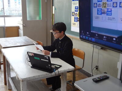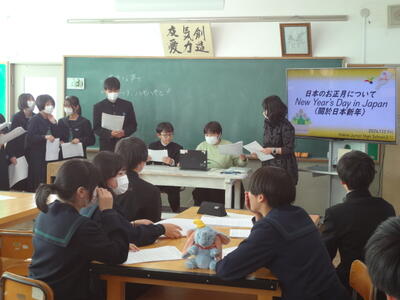 1月12日(金)に本校の中学2年生が台湾の東光中学校とWeb交流を行いました。本校の生徒は、日本のお正月の過ごし方、鏡餅・しめ縄・門松等の正月飾りについて、お正月の料理について、書初め・年賀状・お年玉について、お正月の伝統的な遊びについて、初詣とおみくじについてを各班で発表しました。台湾の東光中からは春節の連句・大みそかの爆竹、神島伝説、ネズミの結婚、おせちの様々なシンボルと祭のタブー、小春節について発表がありました。最後にお互いに質問と回答をして交流は終わりました。
