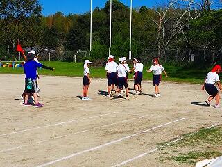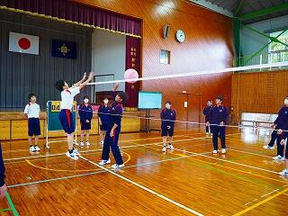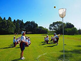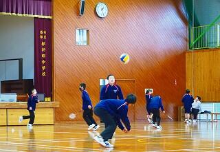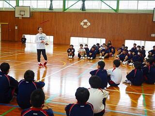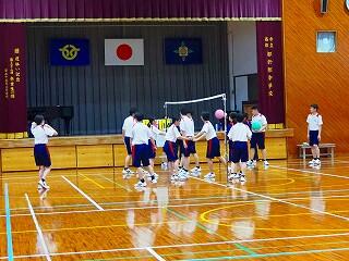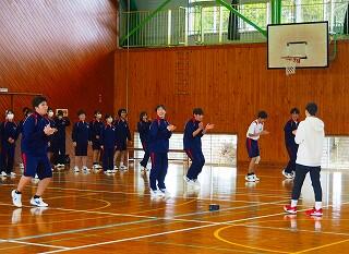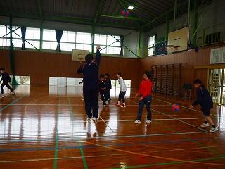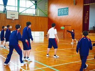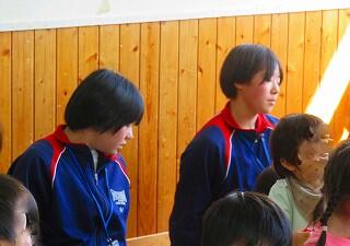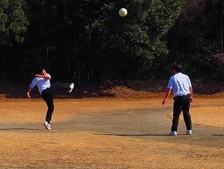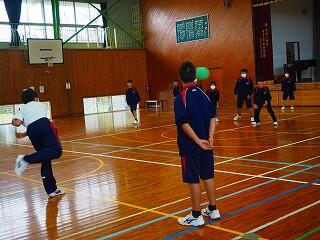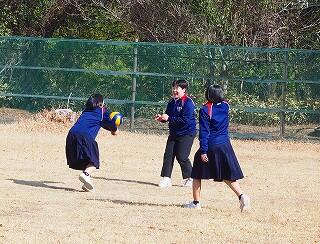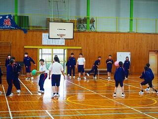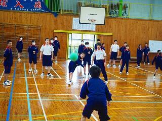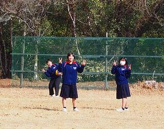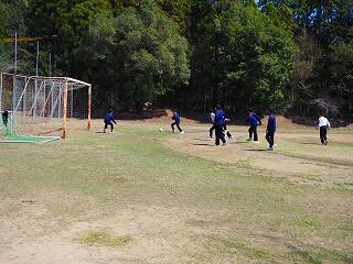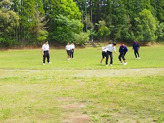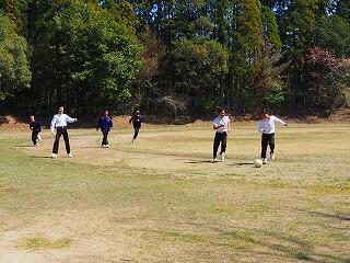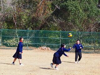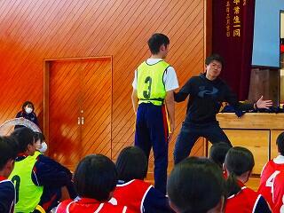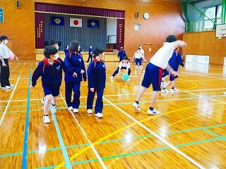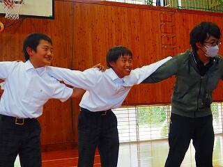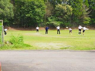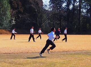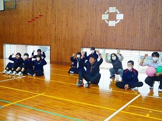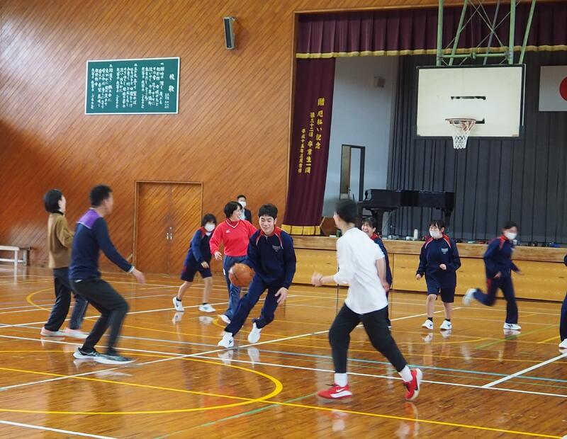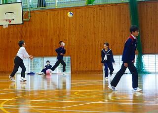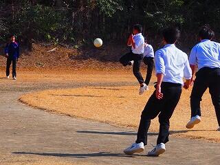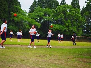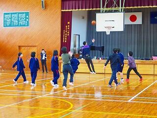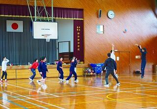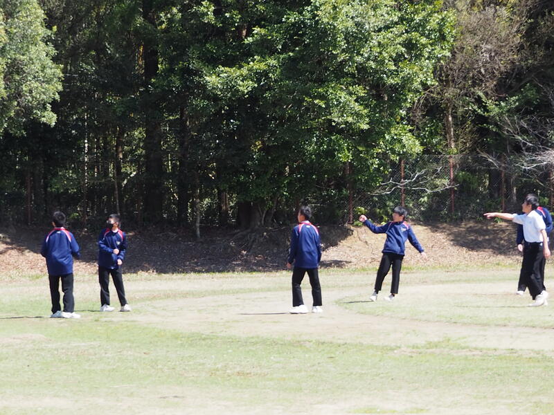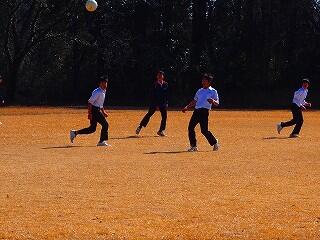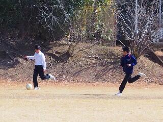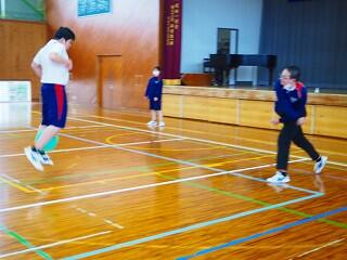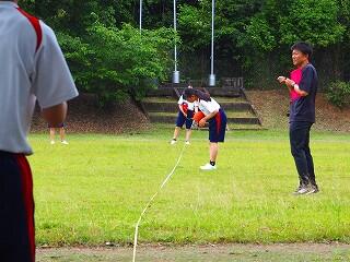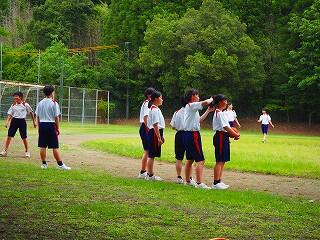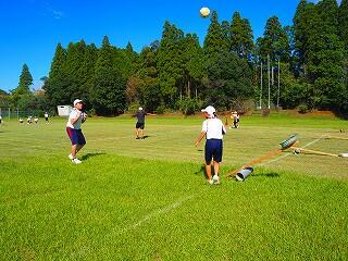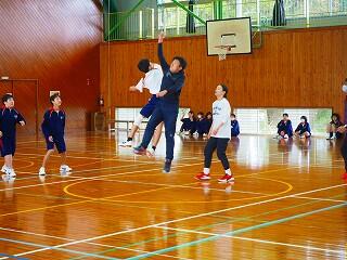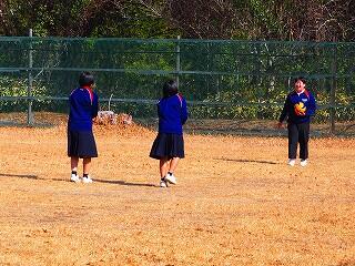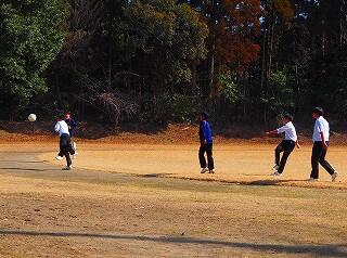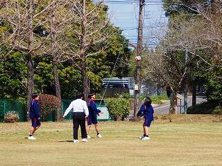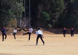 休みの日に、たまたま運動場に遊びに来ていた卒業生と3年生。