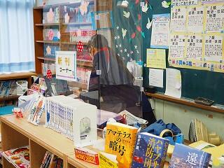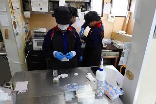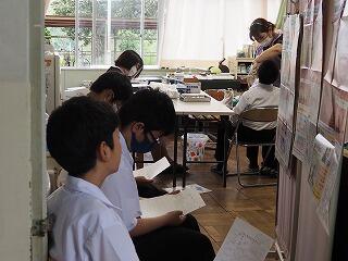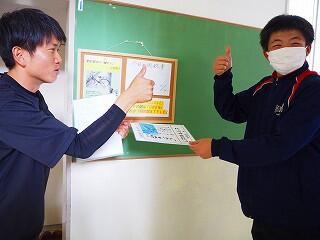 保体給食委員会の感染症対策班の人たちが、昼休み時間に集まって作成していたかぜ予防のクイズの掲示物。完成しました 放課後、保健室前の掲示板に貼りました。