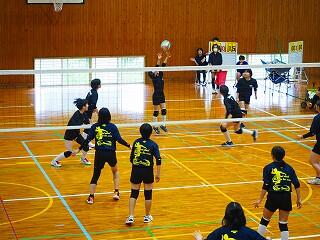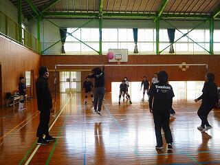 バレー部とバスケット部が、半面ずつ使って練習しています。