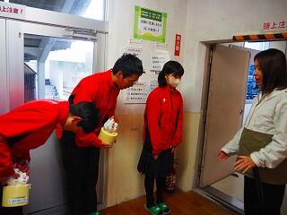 毎朝、生徒会役員が交代で生徒玄関の所で募金箱を準備しています。