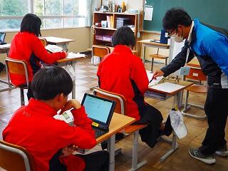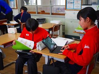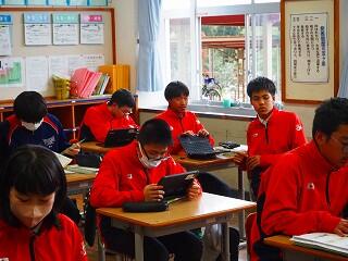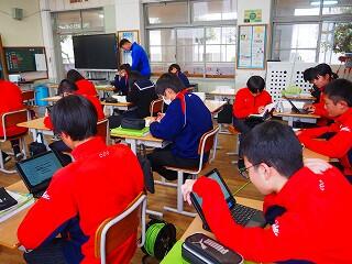 「ICTを活用してゲームを作りました。班の人と話し合ったりインターネットを活用したりして、楽しみながら問題を作りました。家で自分でゲームをするのと比べると、みんなで話し合ったり大声で笑ったりして、とても楽しかったです。」