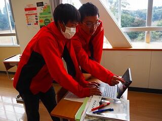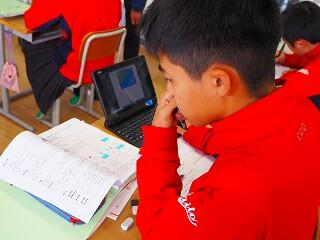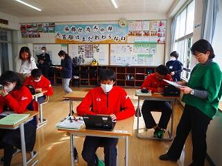 「ICTを活用してゲームを作りました。班の人と話し合ったりインターネットを活用したりして、楽しみながら問題を作りました。家で自分でゲームをするのと比べると、みんなで話し合ったり大声で笑ったりして、とても楽しかったです。」