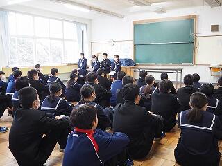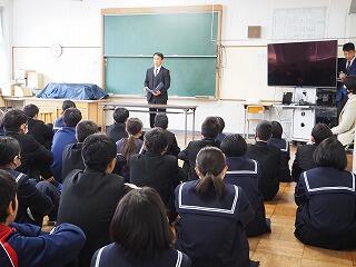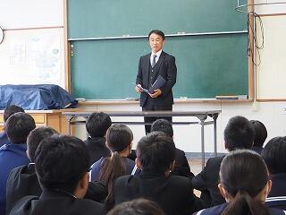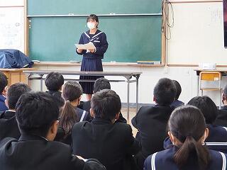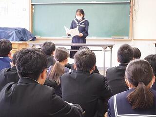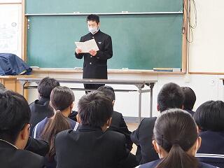 「新聞に掲載された中学3年生の作文を紹介します。・・・体育大会などの大きな行事は年々充実してきて、3年生ではいろいろな行事が最後の行事になるので、さらに頑張った。しかし、受験は初めてのことです。初めての受験に向けて後悔のないように、前向きにしっかり自分で考えて取り組んでいるところが素晴らしいです。みなさんもそれぞれに自分で考えて、3学期は取り組んでいきましょう。」