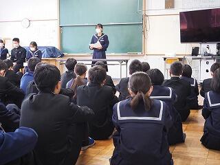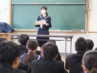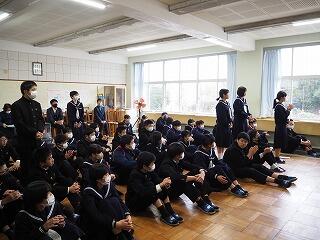 まずは、生徒会長から「寒い時期なので体調不良者が増えてきているので気をつけること。3学期にもなり、みんなの仲も深まってきている。しかし、話し合いの場面などでは、一人一人が自分事ととらえて考えたり意見を出したりすることを、頑張っていきましょう。」と、話がありました。