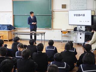「3学期は、何と言っても感染症対策です。ウィルスと闘う力『抵抗力』を低下させないために、まずは私たち一人一人ができること『睡眠』『栄養』をしっかりとること。とくに朝ごはん、ごはんやパンなどの主食だけではなく、おかず類を食べてくることを意識してください。腹持ちも良いですよ!」
