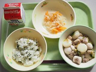【今日の給食】大根葉ごはん、具雑煮、紅白なます