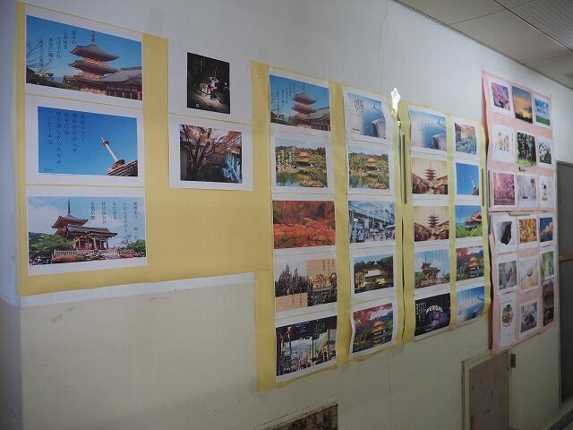 2年生の修学旅行中の国語科の課題として出されていました。写真と組み合わせて完成今日、図書室前に掲示されました。
