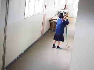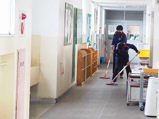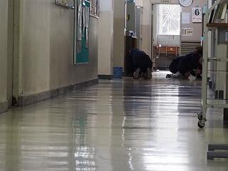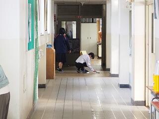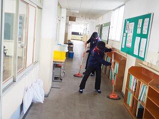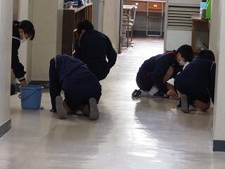 2月6日(火)朝のボランティア活動の一環として、バレー部の皆さんんが玄関付近の廊下をきれいにする清掃活動に取り組んでいました。