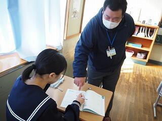 3年間の思い出をそれぞれ英文にまとめ、出来上がった人はALTの先生にチェックをしてもらいます。