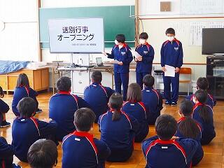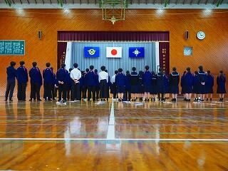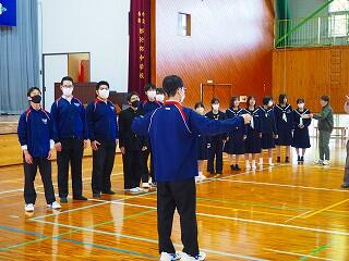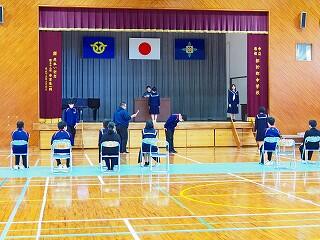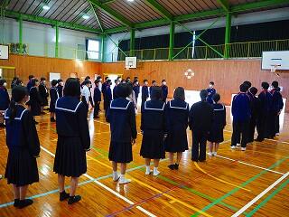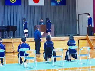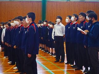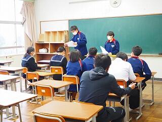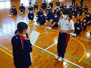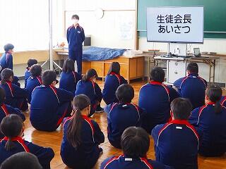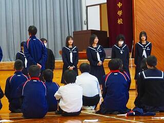 【生徒会代表】「3学期は送別行事や卒業式など、一人一人が全力で準備などに取り組んでくれた。うれしかった。来年度は生徒数が減るので、さらに一人一人が積極的に行動していく必要がある。よりよい学校づくりを目指して頑張りましょう!」