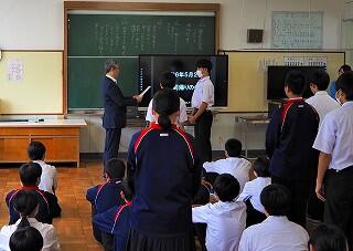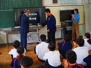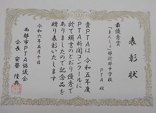 令和5年度のPTA新聞コンクールにおいて、都於郡中学校のPTA新聞「まんしょ」が最優秀賞 に輝き、表彰されました。代表して、昨年度のPTA会長が受け取られました。