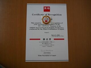 英検での満点賞、なかなか取れるものではないそうです。素晴らしい