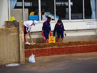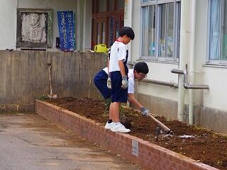 先だっての2年生の花壇整備活動に続いて、今日は1年生の活動です。花壇に肥料を混ぜて、耕して、土作り作業です。