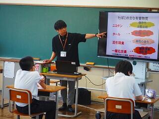 「今日の学習で、たばこ1本で5分30秒寿命が短くなることを初めて知りました。交通事故よりもたばこの害での死亡が多いことや、未成年で吸うと依存しやすくなることなどを学びました。」