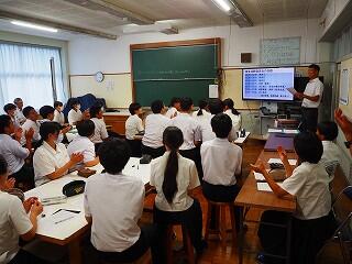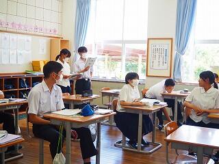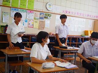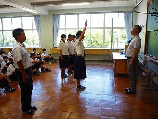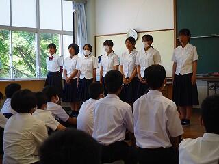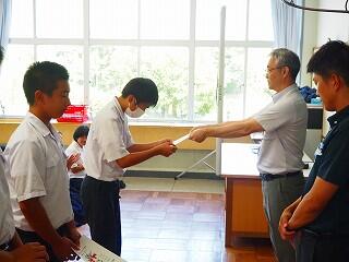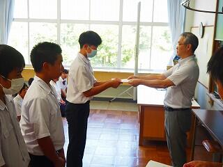 都於郡中の生徒会スローガン「3C」を達成するにふさわしい教室環境の審査基準で、1年生が最優秀賞に輝きました。全校生活美化委員長から1年生に賞状が贈られました。