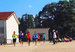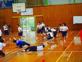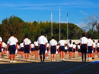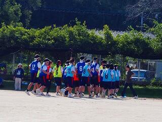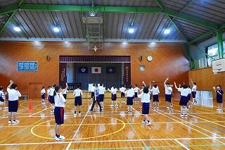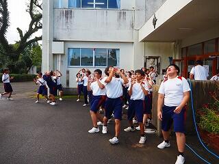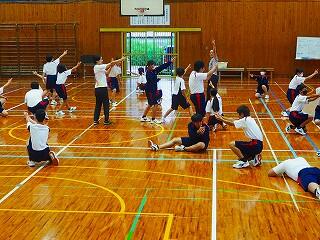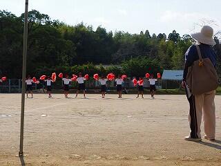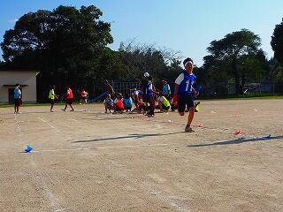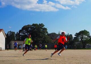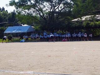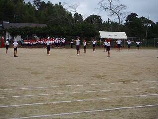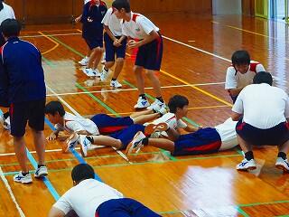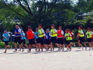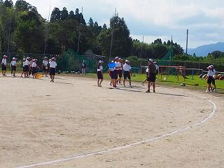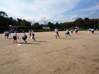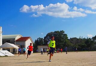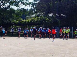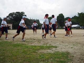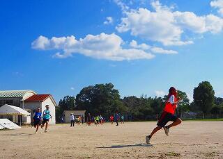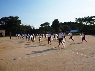 まずは、しっかり準備運動をします。広い運動場に掛け声が元気よく響き渡り、気分も上がってきている感じです。