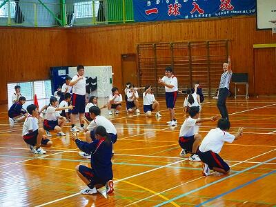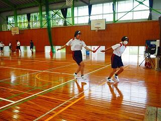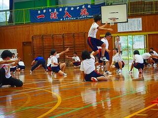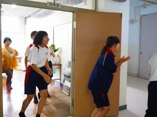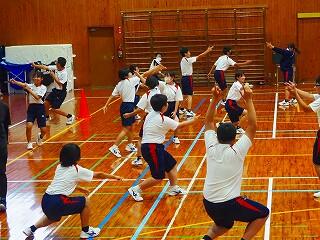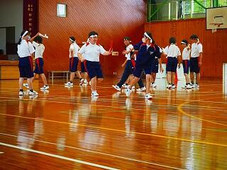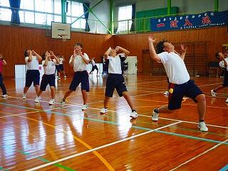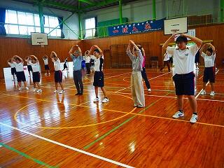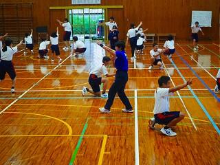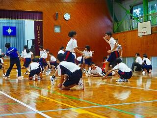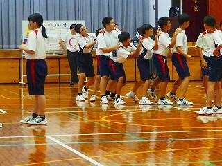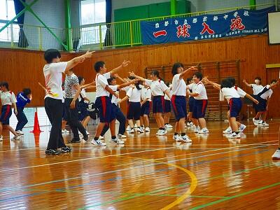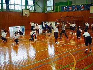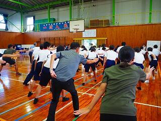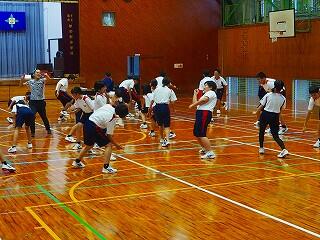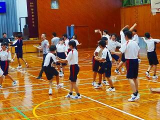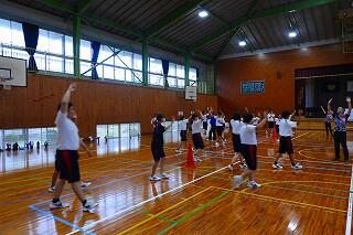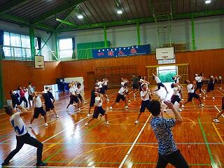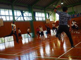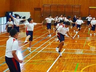 雨のため、室内での練習。半分はダンスの練習、半分は体育館でリレーの練習です。