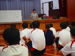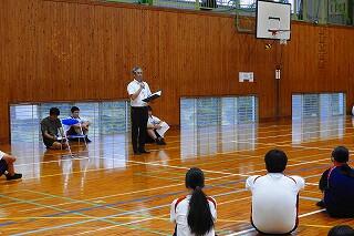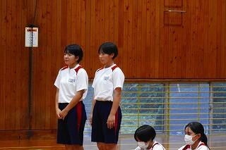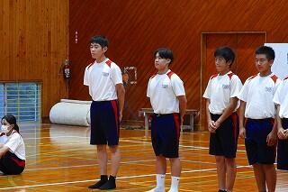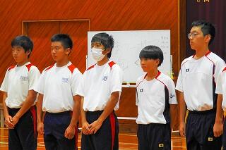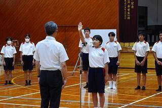 「旧生徒会の皆さんは、それぞれに良いカラーを出してくれました。他の中学校との意見交換の場などでも、いろいろな意見を出したり、まとめたりなど素晴らしい力でした。『3C』をいろんなところで発揮してくれました。新生徒会がこの伝統をしっかり受け継いでいってくれると思います。また、役員だけが生徒会ではありません。自分がやってみよう!と思うことが大事。選挙の時にも、たくさんの人が立候補してくれました。ジーンときました。その気持ちが大事。一人一人が、自分が主役という気持ちを持って生徒会活動に参加することが大事。一人一人が考えて意見を出して、リーダーが決定し、みんなで活動していく『ボトムアップ』式で活発な活動ができるのが中学校の生徒会組織でもあります。これから新しい生徒会の活動として、意識してほしいと思います。」