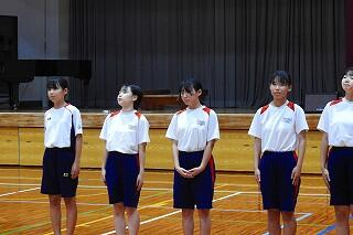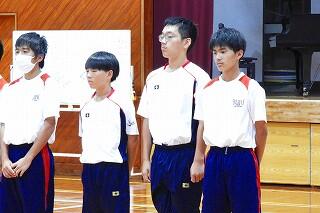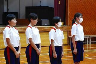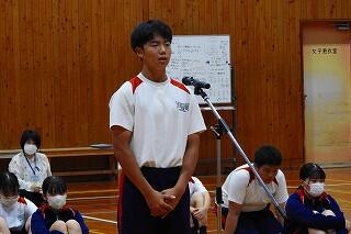 「生徒会長という仕事を通して、自分自身を大きく成長させることができた1年間でした。1年生の時、書記会計で初めて生徒会の役員になった時は、人前で話すことはとても苦手でした。それが今では、このように人前でも堂々と自分の考えを言えるように成長しました。それは、『失敗しても間違っても大丈夫!』という仲間の存在、支えがあったからだと思います。みなさんも、自信を持ち、仲間を信じて、これからも成長させていきましょう!」