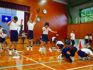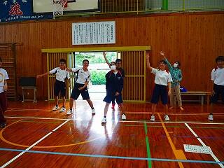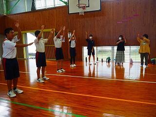 んまつーぽすの皆さんと体育科の先生方の例を見てイメージした後に、自分たちのパートを練習です。