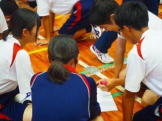 2校時目に練習したことをもとにして班でアイデアを出し合い、自分たちのダンスを図に表していきます。