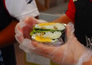 大きな海苔の上に「ごはん」と「具」をのせて、パタン、パタンとたたんでいって、ラップでしっかり包みます。