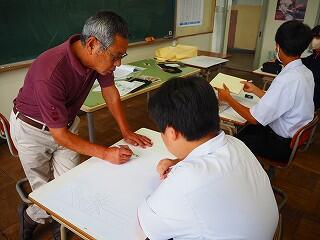 「この版画では、残すところが黒、切るところが色を付けるところなど、考えながら下書きを作らないといけないので、最初は難しいんですよ。みんな一生懸命考えながら作っています。」