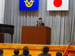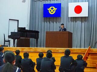 「①3学期は発表を頑張りたい。1,2学期の全校学活などで、3年生の姿を見て『すごいな!』と思った。自分も、得意、不得意区別することなく発表できるように頑張りたい。 ②卒業式は、3年生を送るための大切な行事。3年生が『この学校で良かった!』と思ってもらえるような卒業式にしたい。 ③3年生が卒業すると人数も減り活気が小さくなってしまう。自分から全校生徒を引っ張っていくことができるように頑張っていきたい。」